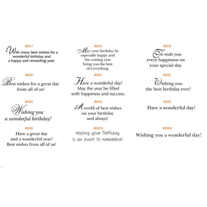 A bit of style can go a long way! With whatever greeting you choose to put inside, the front of this birthday greeting card will stand out. Simple, yet sophisticated, these card feature a green and silver dotted design with green text bar. It's sure to get attention! Select one of our many birthday greetings to print inside the card to make your ideal birthday card. Made with white card stock in the USA. Price includes a one color imprint in one of the standard color listed. Imprint will appear below the inner greeting message.Blank white envelopes. Up to 4 lines of text (fitting the standard imprint area and only in the Baskerville font) is available in lieu of your logo imprint. Personalized envelopes, self-seal envelopes, and foil stamping are available for additional costs. Please call for more information.