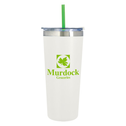 Grab these striking 24 oz customized tumblers in black or white, with a colorful choice of straws to make a color imprint pop. Includes stainless steel outer and inner with vacuum insulation to keep hot and cold drinks at the ideal temperature. Includes a special snap-on spill-resistant flip-top lid with straw holder and 9 1/2" straw. Meets FDA requirements and BPA free. Includes a non-slip bottom. Choose a tumbler color and a straw color to create the best travel mug for your group. Price includes one color, one location imprint. An additional imprint color is available for an added fee. Optional second-side imprinting or an engraved logo are available for an added fee. Must order in full carton quantities of 36.