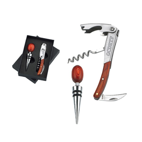 Wine lovers will love this gift while at the same time you can tastefully promote your brand. The corkscrew is made out of stainless steel and the wine stopper is chrome plated. Both have rosewood handles. These two stellar items come neatly packaged in their own gift box. Price includes a laser engraving on the opener and a one color imprint on the gift box. Second imprint and/or engraving is an additional charge. Please call for more details on these promotional corkscrew gift sets.