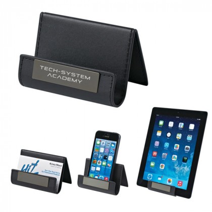 Offering a sleek, professional look at an affordable price, the Execu-Buddy is sure to find a home on their desks. Great for holding business cards, or as a tablet or phone stand. Hand them out to promote your consulting firm, computer school, or networking group, and they'll show off your logo with pride. Designed to look like leather at a fraction of the price. To complete the effect, each holder comes prepackaged in an attractive gift box. Includes a laser engraving on the front metal plate. Please call for more information.
