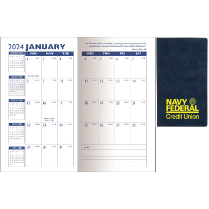 Cover almost the entire front cover of this promotional planner with your custom imprint. The marble color selection, of almond, black, blue, burgundy, charcoal, dark blue, dark green, gray and green, provide an excellent background to your unique message. Imprint a fun saying to get people thinking about your company or a message to support a specific cause. The rounded corners of the booklet and worn look of the cover provides a casual design. It features 32 pages and shows one month on a two page spread. The planner inside is printed in blue and runs 14 months, from December through January. It includes pages for important phone numbers and dates as well as advance planning areas. Also included are metric conversion charts, time zone chart, area code table and an important holidays page. Choose from a variety of foil imprint colors included in the price. Please call for more details.