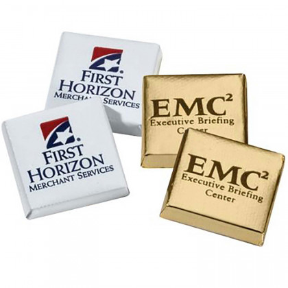 Offer these delicious chocolate squares as a great reminder! These custom treats will have your brand on the mind whenever eaten. Give them away at events, put them in the break room, or even put them on pillows for your guests! Add a colorful design to the wrap for a great reminder of your brand or services. Everyone has a sweet tooth! Foil wrap comes in gold, silver, or white. Milk or dark chocolate. The price includes a full-color imprinted wrap. Please call for more information.