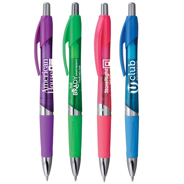 Chrome accents and pleasing colors create the visual appeal, and ergonomic design and a comfortable rubber grip create the lasting desire to keep this promotional plastic pen in use. Top it off with a low price, and the result is a promotional pen that will become a staple in promotional giveaways lists. The jumbo curves will lead eyes to your custom imprinted logo on the barrel.