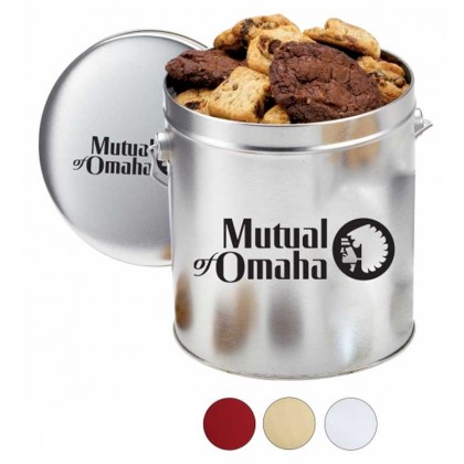 Your company name is sure to stand out on this gallon tin filled with gourmet cookies. Assorted Cookies (Chocolate Chip, Oatmeal Raisin, Double Chocolate Chip with Walnuts, S'Mores, Red Velvet, and White Chocolate Macadamia Nut) will have something to please everyone. Approximately 24 cookies. Price includes a full color label on the lid. Direct imprints on the lid are available for the same price. Imprints on the body are also available for an added cost. Please call for more details.