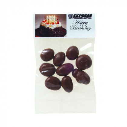 A great snack to giveaway at tradeshows and conventions, this one ounce bag is filled with chocolate covered raisins. Your company is sure to stand out by giving the custom imprinted bag to tradeshow and convention participants. Each pack contains a customized header included in the price. The header card is printed in full color on both sides giving your design or message twice the views! Other fills, such as chocolate covered peanuts, are also available. Please call for assistance and pricing.