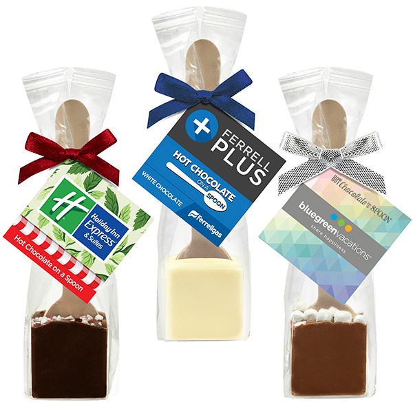 Chocolate spoons are a perfect treat to keep your customers warm in the winter months! This fun giveaway features mouthwatering chocolate on a spoon. When they want a sweet treat, they can mix it into a cup of piping hot milk for an instant cup of delicious hot chocolate. Also great for giving coffee a sweet, mocha-like flavor. Each of our chocolate spoons comes in a favor bag with a bow and a hang tag for your message, with usage instructions on the back of the hang tag. Available in a variety of delicious flavors, including a Mexican milk chocolate blend with cayenne pepper and cinnamon. They go great with any of our custom mugs and add some extra flavor to a steamy cup of hot chocolate! Please call for more information.