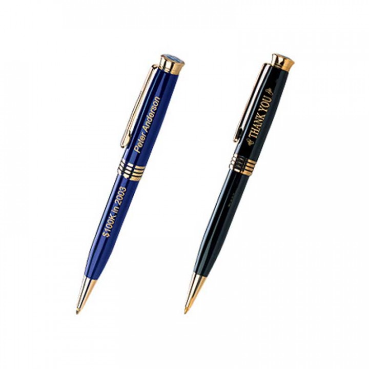 This classic style, quality brass twist action ballpoint metal pen features a full-color logo on the dome and guaranteed a smooth, jumbo writing cartridge. The option of cap or barrel imprinting is available, please specify when making an order. Price includes straight line laser imprint and each pen is individually cellophaned. Black ink only.