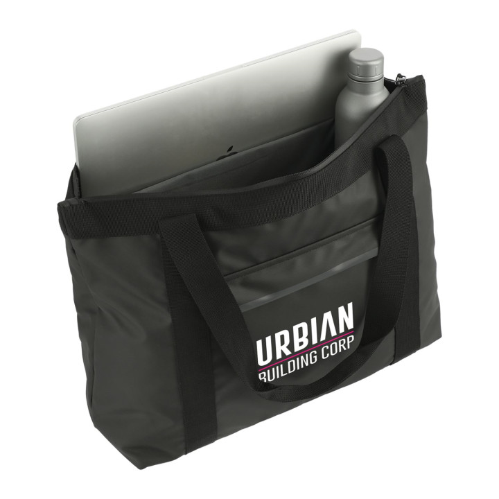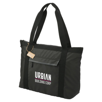 Inspired by popular retail brands, this all-weather upscale promotional tote has all the desirable features with no brand needed (NBN). Instead, customize this eco-friendly recycled tote with your own logo for a quality promotion that will see a lot of travel. The waterproof tape on the top zipper keeps contents dry. No worries when dashing through the raindrops. An exterior pocket also has a rain flap to keep phones and other small items from getting wet, while inside there is a laptop sleeve and a zipper pocket to help keep things organized. Made with recycled 600D polyester made from plastic bottles. A one-color digital transfer is included in the price. Please inquire regarding other imprint options.