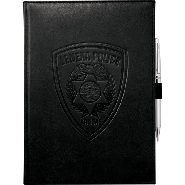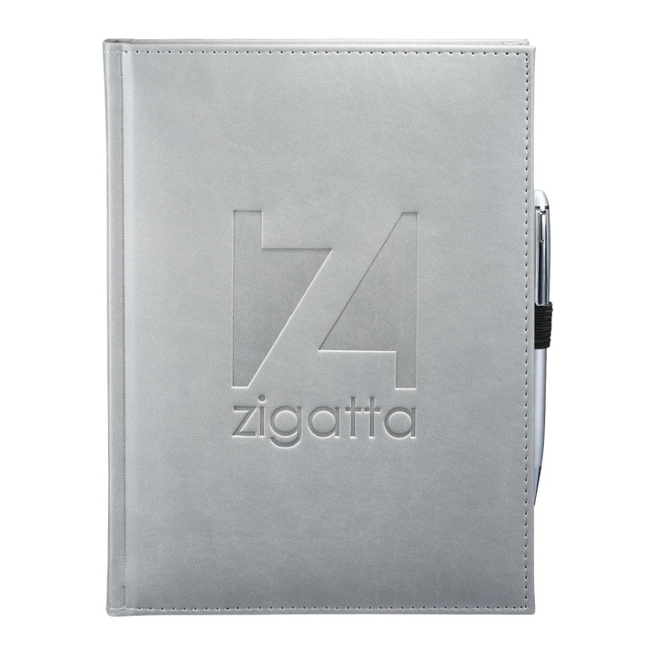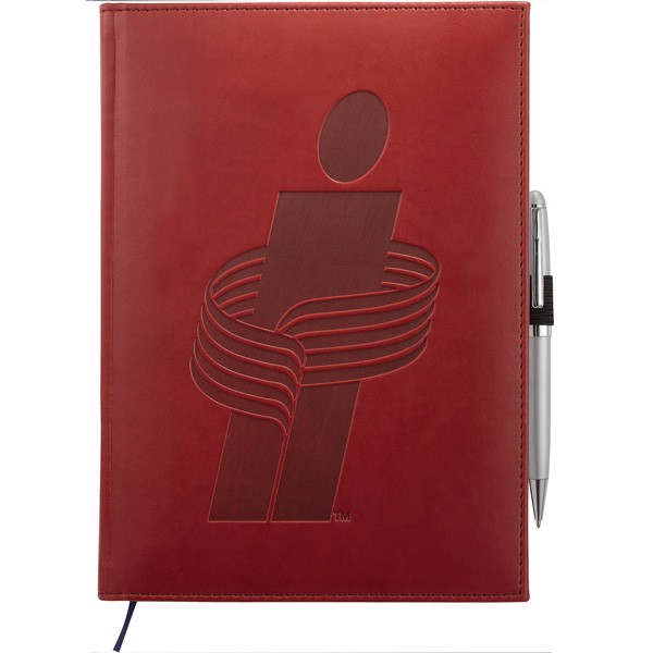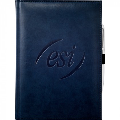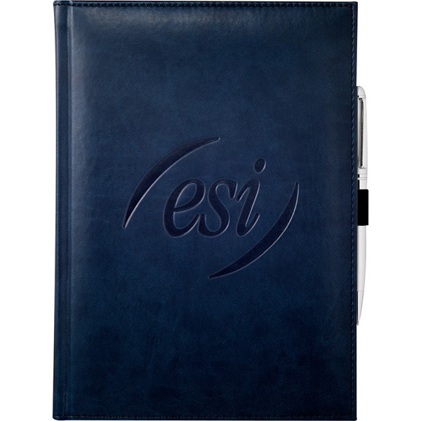 This Large Bound Journal Book contains 125 sheets of lined paper. Imprint your custom logo on the Italian UltraHyde cover. Elastic pen loop. Blue and silver ribbon page markers. A debossed imprint on the front is included in the price. Additional imprint locations are available. Please call for more details.