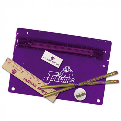 Finally a school kit that has everything! Two pencils, a ruler, an eraser, and a sharpener all securely contained in a colorful vinyl zipper pouch with binder holes. And with all the included imprints with this fabulous school promotional item, the ongoing advertisement is worth every penny! Incredibly versatile with all the color choices for each item in the kit. Match school colors or create a rainbow of creativity. A one color imprint on the pencils, ruler (straight line text only) eraser, and pouch packet is included in the price. Logos on the ruler or sharpener carry an added cost.