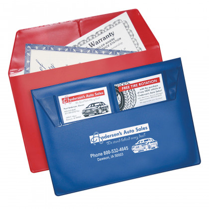 This custom document holder is designed specifically for keeping important items such as an owner's manual, insurance cards, and registration papers all nicely organized in the glove box. The exterior of this vinyl pouch has a slot for business cards, which is the perfect way for auto sellers and repair shops to keep their name handy too. The interior is extra roomy so inspection papers, repair records, and other documents can also be kept organized. Just stuff them in, fold the flap over, and keep this custom folder tucked away. Made in the USA. A one color imprint on the front up to 10 square inches is included in the price. Please call for assistance.